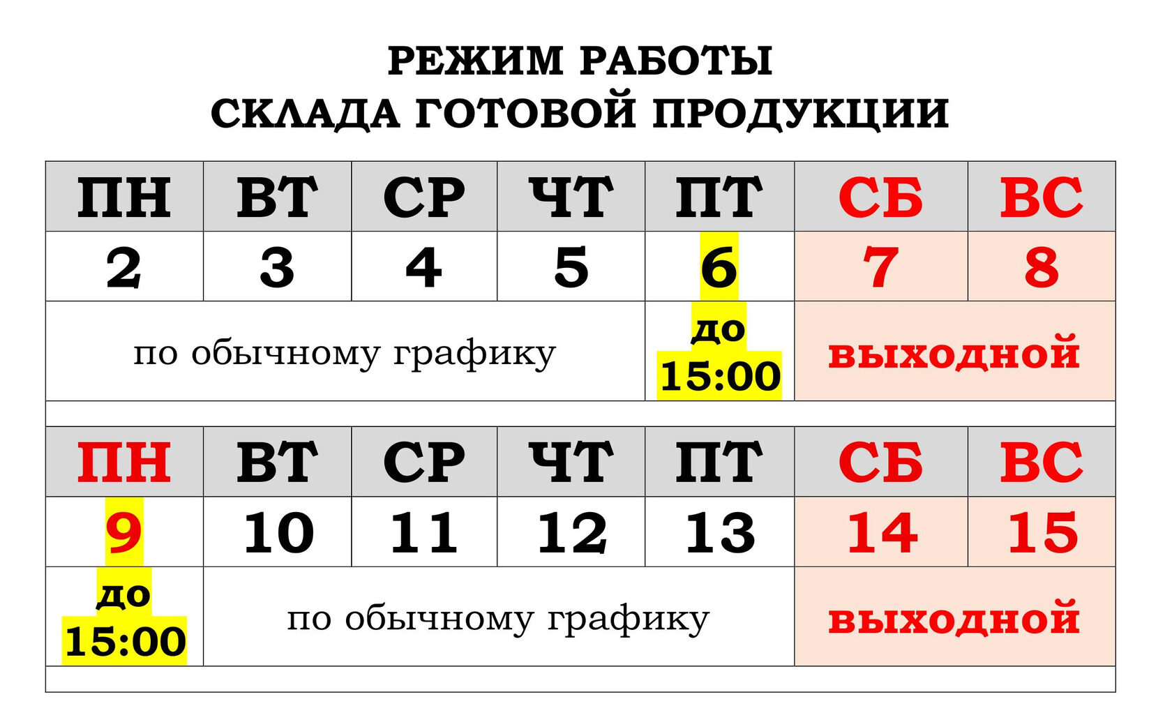 В пятницу (06 марта) и понедельник (09 марта) склад готовой продукции в Славске работает до 15:00 (обед: 13:00 - 14:00). В остальные дни — по обычному графику.